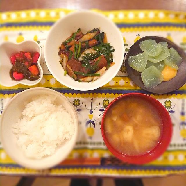 夕ごはん ニラレバ炒め 刺身こんにゃく もずくとトマトの酢の物 味噌汁