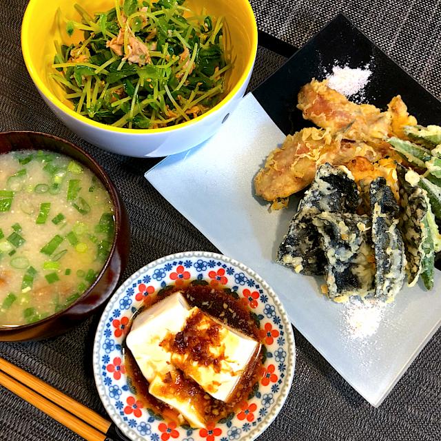 片口鰯の梅肉天 オクラ天 海苔天 豆苗とシーチキンの胡麻サラダ 湯豆腐
