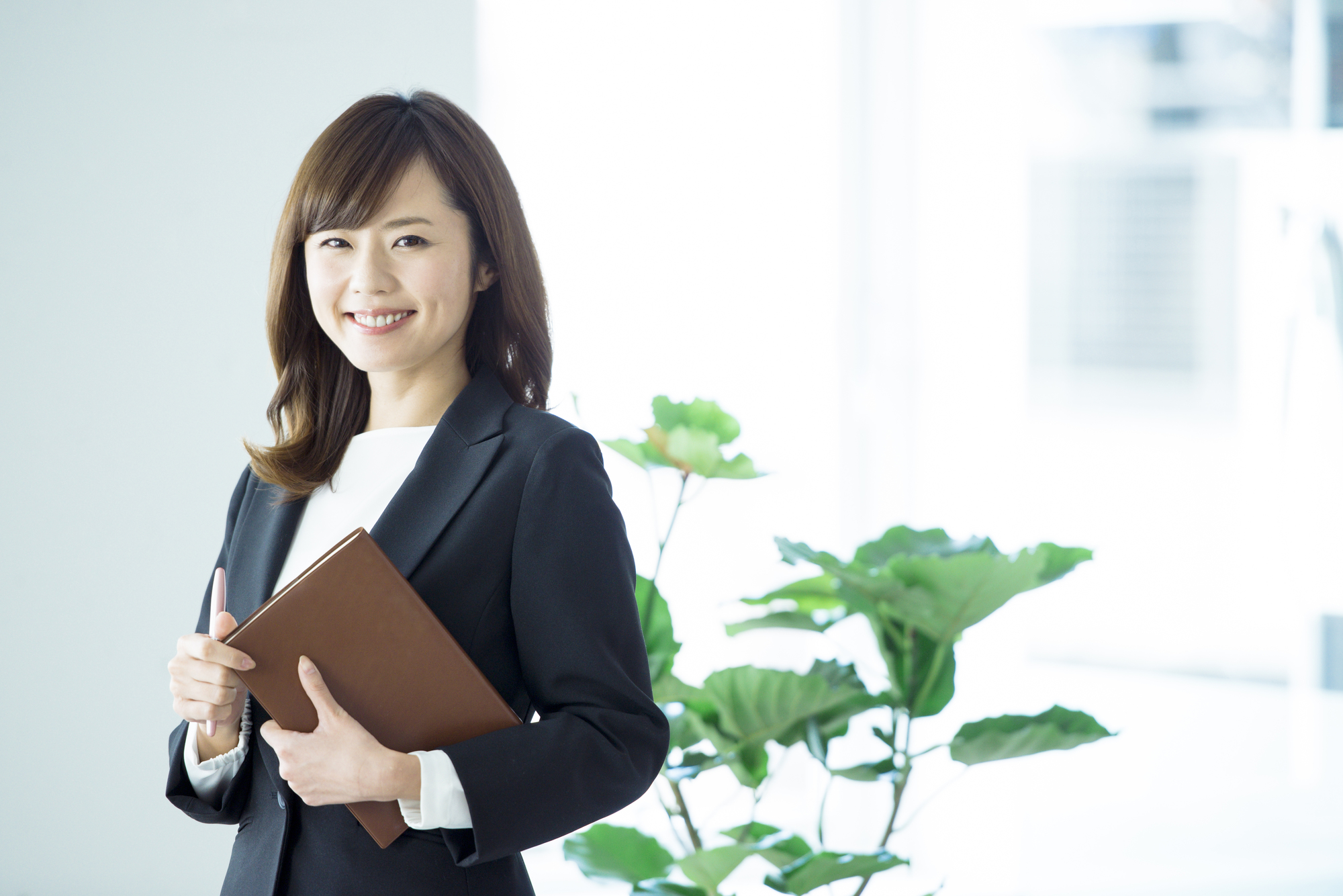 ビジネススーツを着た魅力的な笑顔が素敵な女性 正面 会社案内 業務
