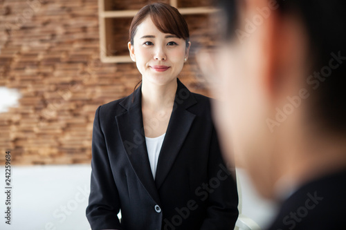 面接に来たスーツの女性が笑顔を見せている Adobe Stock でこの