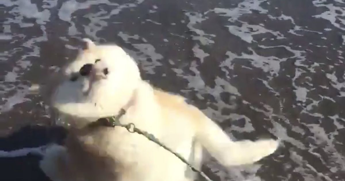 はじめての海で波に慌てる秋田犬が超かわいい動画 途中まで余裕なのが