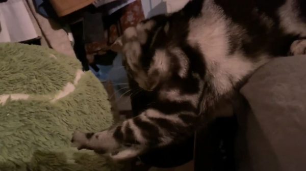 エクストリームな ふみふみ を見せる猫 ベッドの上から地面の